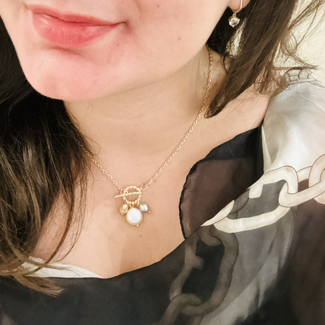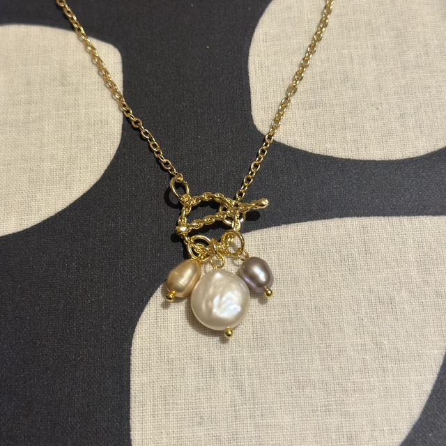 Embrace your femininity with this 2-in-1 bracelet and necklace. This versatile piece can be styled as either a bracelet or a necklace, blending modern elegance with classic charm. The necklace is crafted from 18k gold plated stainless steel, and it features a clasp adorned with three stunning pearls: lilac and blue freshwater pearls, along with a white iridescent baroque Keshi pearl.