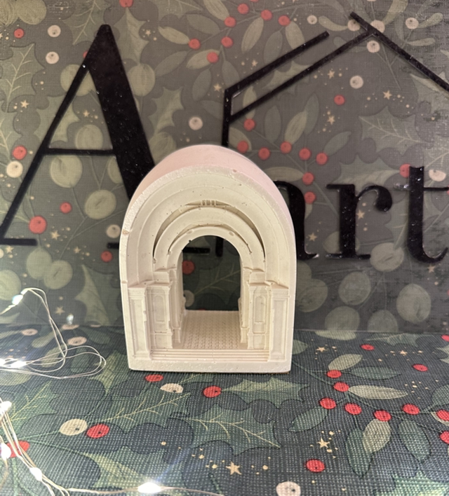 The arch is handmade from eco-friendly, non-toxic Jesmonite material. Jesmonite is a very versatile material that has many benefits as durability, fire resistance, consistent quality, UV stable, water resistant, freeze thaw resistant and impact resistant. The material also has a feeling like marble to the touch.