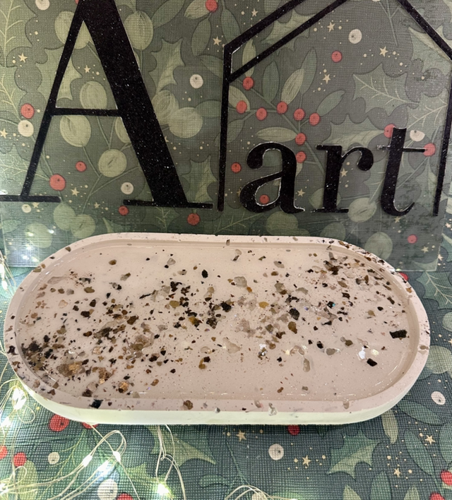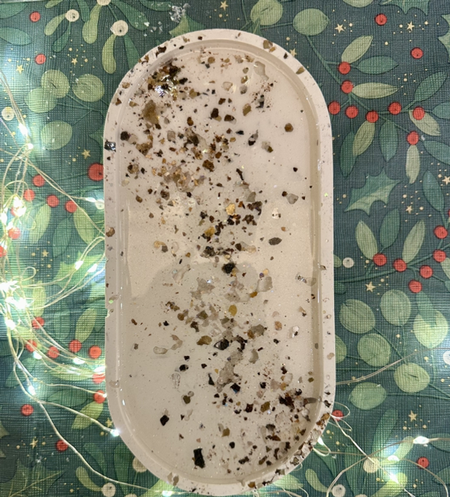 This beautiful and elegant tray is handmade from Jesmonite. Jesmonite is a very versatile material that has many benefits as durability, fire resistance,  consistent quality, UV stable, water resistant, freeze thaw resistant and impact resistant. The material also has a feeling like marble to the touch. The tray also has a coat of resin on top and little legs.