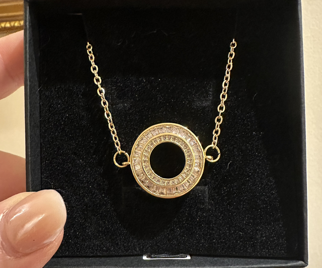 This striking necklace features a sleek gold chain with a chic circular pendant, elegantly framed with sparkling crystals. Perfect for both day and evening wear, this piece effortlessly elevates any outfit, making it a must-have addition to your jewellery collection.