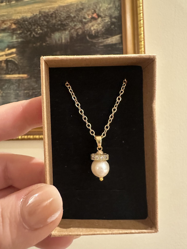 Materials: 18k gold plated brass, cubic zirconia, pearl, 18k gold plated stainless steel necklace