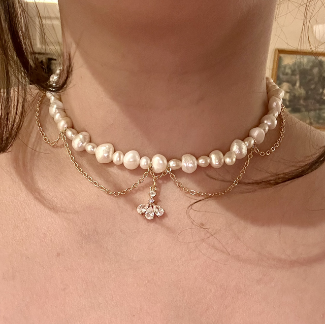 Materials: 18k gold plated brass, cubic zirconia, freshwater pearls, 18k gold plated stainless steel necklace