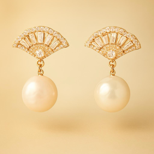 These elegant earrings feature a stunning fan-shaped design adorned with intricate detailing and sparkling accents, complemented by a beautiful pearl drop. The combination of luxurious materials and a sophisticated aesthetic makes them a perfect accessory for any formal occasion or a chic addition to everyday wear. It earrings are also hypoallergenic, ensuring suitability for even the most sensitive skin. Since we use only natural pearls, you might notice slight variations in shape and size. Additionally, we offer a one-year guarantee from the date of delivery.